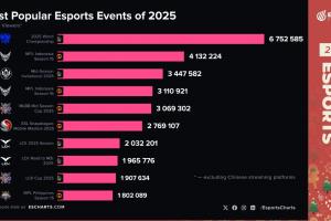 體育資訊12月26日訊?Esports Charts統(tǒng)計(jì)2025年最受歡迎的電競賽事前十名:(觀賽峰值)