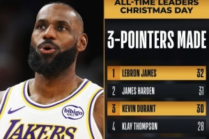 圣誕三分榜TOP10!老詹獨(dú)占第1 掘金穆雷沖至第7 僅雷迪克非現(xiàn)役