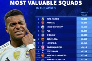 體育資訊12月26日訊 2025年接近尾聲,德轉(zhuǎn)列出了全球球隊(duì)身價(jià)排名前二十,皇馬以13.8億歐排名第一,阿森納12.9億歐第二,曼城、巴黎分列第三、第四。