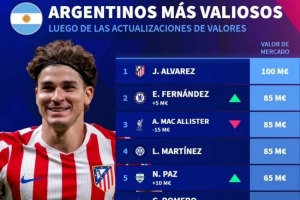 體育資訊12月27日訊 德國(guó)轉(zhuǎn)會(huì)市場(chǎng)更新了各大聯(lián)賽球員的身價(jià),并列出阿根廷球員身價(jià)排名,阿爾瓦雷斯1億歐居首。