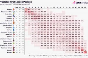 Opta預(yù)測英超:槍手奪冠概率68.5%第1曼城第2,狼隊(duì)降級概率99.9%
