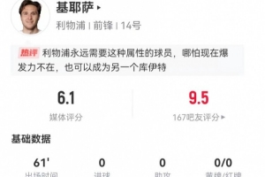 體育資訊12月28日訊 利物浦在本輪英超對(duì)陣?yán)顷?duì),本賽季首次在聯(lián)賽首發(fā)的小基耶薩本場(chǎng)數(shù)據(jù)如下: