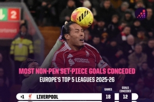本賽季五大聯(lián)賽定位球失球榜(非點球):