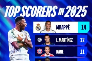 以下是2025自然年歐冠射手榜單: