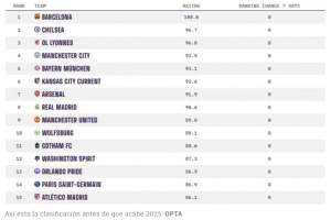 相比之下,男足的排名則有所不同。阿森納以滿分100分位居榜首,拜仁慕尼黑(98.2分)和曼徹斯特城(98.1分)分列第二和第三位。巴黎圣日耳曼(96.5分)和巴塞羅那(95.6分)也名列前茅?;始荫R德里男足目前排名第10,評分為93.4分,在最近一次更新中下降了兩個位置。切爾西(第8位,93.7分)和國際米蘭(第9位,93.6分)都超過了他們。