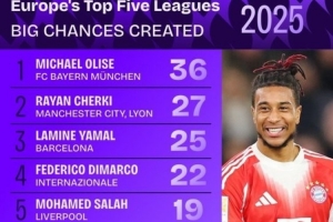體育資訊12月31日訊 2025年即將結(jié)束,數(shù)據(jù)機(jī)構(gòu)squawka也統(tǒng)計(jì)了本年度五大聯(lián)賽創(chuàng)造重大機(jī)會(huì)情況,奧利塞獨(dú)自領(lǐng)跑。