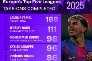 體育資訊12月31日訊 2025年即將結(jié)束,squawka也統(tǒng)計(jì)了本年度成功過人情況,亞馬爾斷崖領(lǐng)跑。