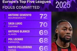 體育資訊1月1日訊 Squawka統(tǒng)計2025年五大聯(lián)賽球員犯規(guī)次數(shù)榜,塞梅尼奧72次居首。