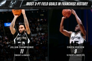 11記三分打破馬刺隊(duì)史單場(chǎng)三分球命中紀(jì)錄,此前由查克·珀森保持(9記)。