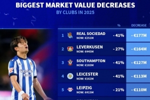 體育資訊1月2日訊 2025年已經(jīng)結(jié)束,《轉(zhuǎn)會市場》也統(tǒng)計(jì)了年度球隊(duì)身價(jià)貶值榜,皇社、藥廠分列前二。