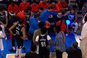 GIF-楊瀚森和阿夫迪亞主動(dòng)溝通 不過(guò)后者似乎有些沒(méi)懂 喊了翻譯過(guò)來(lái)之后聽(tīng)懂 隨后和楊瀚森碰拳