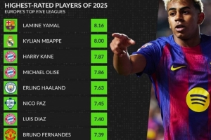 體育資訊1月3日訊 whoscored統(tǒng)計(jì)了2025年五大聯(lián)賽場(chǎng)均評(píng)分榜,亞馬爾力壓姆巴佩居首。