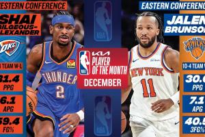 體育資訊01月03日訊 NBA官方宣布,尼克斯布倫森與雷霆亞歷山大分別當(dāng)選12月東西部月最佳球員。