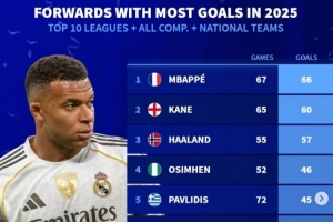 體育資訊1月4日訊 《轉(zhuǎn)會市場》統(tǒng)計(jì)了2025年前十聯(lián)賽前鋒的俱樂部+國家隊(duì)各項(xiàng)賽事進(jìn)球最多情況,姆巴佩居首。