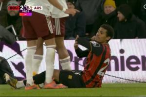 英超第20輪,阿森納客場3-2逆轉(zhuǎn)伯恩茅斯。比賽第95分鐘,伯恩茅斯前鋒阿明·阿德利從側(cè)后方一頭撞向加布里埃爾肘部,隨后倒地捂臉,坐在地上向主裁投訴加布肘擊,但主裁并無表示。