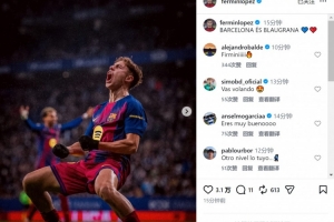 此役費(fèi)爾明替補(bǔ)出場,送出2記助攻,幫助巴薩取勝,賽后他在社交媒體上曬出慶祝的照片,配文:“巴塞羅那是紅藍(lán)色的 ????”
