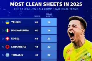 體育資訊1月4日訊 《轉(zhuǎn)會市場》統(tǒng)計了2025年前15聯(lián)賽的門將在俱樂部+國家隊各項賽事總零封場次榜,特魯賓力壓多納魯馬居首。