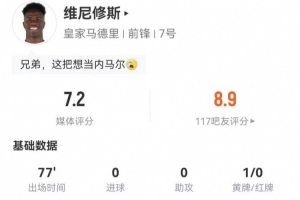 體育資訊1月5日訊 皇馬在本輪西甲對陣貝蒂斯,維尼修斯本場數(shù)據(jù)如下: