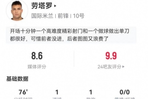 體育資訊1月5日訊 國米在本輪意甲對陣博洛尼亞,勞塔羅本場數(shù)據(jù)如下: