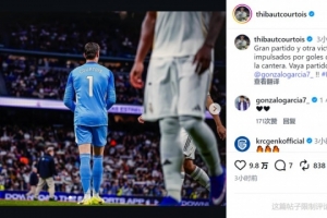 皇馬門將庫爾圖瓦社媒曬出比賽照片,配文:“精彩的比賽,又一場由我們青訓(xùn)球員的進球帶來的勝利?!?/p>