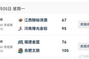 2025-2026賽季W(wǎng)CBA常規(guī)賽今日僅兩場B組比賽。河南和合肥兩隊(duì)均毫無懸念在客場收獲大勝。