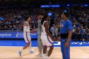 想啥呢?蘭德爾表情古怪 神情“著迷”地上下來回掃視文班全身!