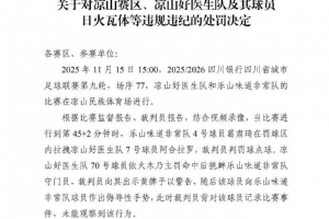 四川省足協(xié)今日對(duì)外公布了11月15日川超比賽涼山隊(duì)和對(duì)裁判實(shí)施暴力行為致使裁判受傷的涼山隊(duì)球員日火瓦體的紀(jì)律處罰決定,決定落款時(shí)間為12月30日。其中日火瓦體被禁賽5年,在四川省足協(xié)管轄范圍內(nèi)生效,并將抄送中國足協(xié)備案。