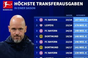 體育資訊7月16日訊 據(jù)德國轉會市場統(tǒng)計,勒沃庫森夏窗引援支出突破1億歐元,成為第5家單賽季引援支出多于1億歐的德甲俱樂部。