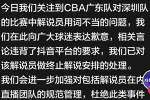 抖音體育官方隨后發(fā)文致歉:今日我們關(guān)注到CBA廣東隊(duì)對(duì)深圳隊(duì)的比賽中解說員用詞不當(dāng)?shù)膯栴},我們?cè)诖讼驈V大球迷表達(dá)歉意,相關(guān)言論違背了抖音平臺(tái)的要求,我們已對(duì)該解說員做終止解說安排的處理。我們會(huì)進(jìn)一步加強(qiáng)對(duì)包括解說員在內(nèi)直播團(tuán)隊(duì)的規(guī)范管理,杜絕此類事件再次發(fā)生,不斷提升賽事轉(zhuǎn)播的質(zhì)量,為球迷帶來更好的服務(wù)和體驗(yàn)。
