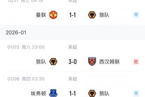 體育資訊01月08日訊 英超第21輪,狼隊客場1-1戰(zhàn)平埃弗頓,英超副班長近3輪保持不敗,連拿5分!
