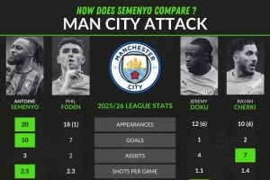 體育資訊1月8日訊 根據(jù)多家媒體的報(bào)道,伯恩茅斯邊鋒塞梅尼奧將加盟曼城,WhoScored統(tǒng)計(jì)了塞梅尼奧與幾位曼城攻擊手本賽季的英超數(shù)據(jù)。