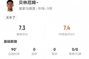 體育資訊1月9日訊 皇馬在本輪西超杯對陣馬競,貝林厄姆本場數(shù)據(jù)如下: