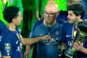 賽后慶祝時發(fā)生了有趣的一幕,隊友們輪流捧起獎杯,而巴黎邊衛(wèi)努諾·門德斯與資深裝備管理員納賽爾丁開玩笑,多次把后者的光頭當作獎杯捧起。