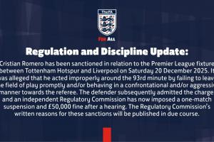 克里斯蒂安?羅梅羅因2025年12月20日(周六)托特納姆熱刺對陣利物浦的英超賽事,遭到紀律處罰。