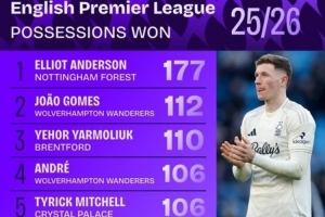 體育資訊1月10日訊 數(shù)據(jù)機構(gòu)squawka統(tǒng)計了本賽季英超贏得球權(quán)情況,諾丁漢森林中場埃利奧特·安德森獨自領(lǐng)跑。