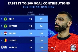 體育資訊1月11日訊 埃及在非洲杯八強(qiáng)戰(zhàn)3-2淘汰科特迪瓦,薩拉赫傳射建功,也達(dá)成了國(guó)家隊(duì)直接參與100球里程碑?!掇D(zhuǎn)會(huì)市場(chǎng)》統(tǒng)計(jì)顯示他也是歷史第三快達(dá)成國(guó)家隊(duì)直接參與100球的球員。
