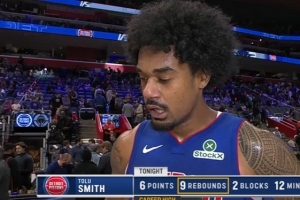 上半場(chǎng),活塞雙向合同球員托盧·史密斯表現(xiàn)出色,籃板已經(jīng)刷新生涯新高(此前7個(gè)),替補(bǔ)出戰(zhàn)12分鐘,投籃4中1,罰球4中4,拿到6分9籃板(4前場(chǎng)籃板)2搶斷2蓋帽的數(shù)據(jù)。
