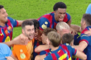 賽后,巴塞羅那球員擁抱在一起激情慶祝。