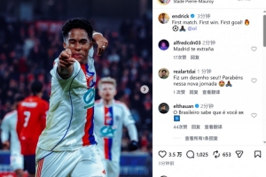 恩德里克冬窗被皇馬外租至里昂,他首次為里昂出場就斬獲進(jìn)球,賽后恩德里克社媒曬出慶祝進(jìn)球的照片,配文:“首秀、首勝、首球!”