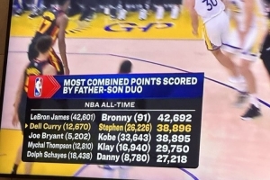 本場(chǎng)比賽過(guò)后,庫(kù)里總得分26240,父子組合總分38910,距離詹姆斯父子還差3782分。
