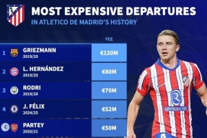 體育資訊1月15日訊 馬競(jìng)已經(jīng)官宣中場(chǎng)加拉格爾轉(zhuǎn)會(huì)熱刺,《轉(zhuǎn)會(huì)市場(chǎng)》也統(tǒng)計(jì)了馬競(jìng)隊(duì)史最貴賣人情況,格列茲曼仍居首。