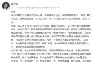 我們懷著萬分沉痛與不舍的心情,向各界親友泣告:中國圍棋界泰斗、“棋圣” 聶衛(wèi)平先生,因病醫(yī)治無效,于 2026 年 1 月 14 日晚 22時 55分與世長辭,享年 73 歲。