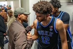 賽后戴爾·庫里、斯蒂芬·庫里、賽斯·庫里父子三人到訪了杜克的更衣室,而作為校友的賽斯見到這群學(xué)弟們也非常開心。