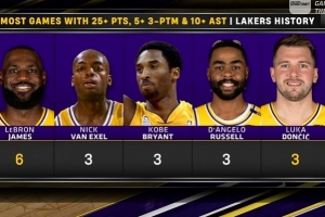 湖人隊史單場至少25分10助&命中3記三分場次:詹姆斯6次最高;東契奇,拉塞爾,科比,范??巳麪柦?次