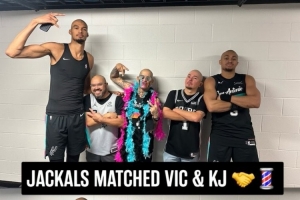 馬刺主場大勝雄鹿,賽后,文班亞馬和凱爾登·約翰遜與主場球迷團(tuán)三位光頭球迷合影,馬刺官推寫道:“看來光頭造型正在流行~”
