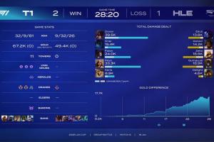 體育資訊1月16日訊 LCK杯T1二比一擊敗HLE,賽后決勝局?jǐn)?shù)據(jù)面板,Doran阿卡麗打出的全局傷害大于Zeka沙皇+Gumayusi燼的傷害總和。