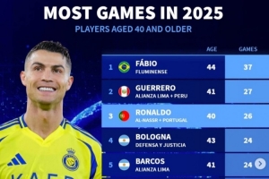剛剛隨弗魯米嫩塞打進世俱杯四強的44歲老門將法比奧以37場居首,曾效力過拜仁的秘魯41歲鋒線老將保羅-格雷羅在今年為利馬聯(lián)盟和秘魯國家隊共計出場27次,40歲的C羅則為利雅得勝利和葡萄牙國家隊出場26次。