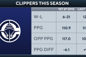 快船前27場 戰(zhàn)績6勝21負 場均得分110.9 場均失分117.0 場均凈勝分-6.1