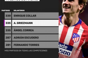 據(jù)Opta數(shù)據(jù)統(tǒng)計,格里茲曼已追平安赫爾·科雷亞,335次出場并列成為馬德里競技歷史上出場次數(shù)第二多的前鋒,目前僅次于恩里克·科拉爾的339場。