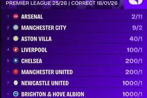 體育資訊01月19日訊 維拉0-1不敵埃弗頓,本輪過后阿森納雖然打平卻擴(kuò)大了領(lǐng)先優(yōu)勢(shì)。阿森納目前以7分優(yōu)勢(shì)領(lǐng)跑英超,依然是奪冠的最大熱門。